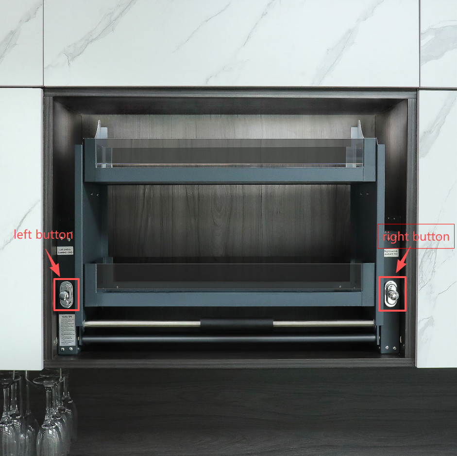 Press both buttons simultaneously. Perfect for storing heavier items such as grains and kitchen appliances.